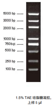 本产品为预混有 1x 上样缓冲液的即用型 DNA 分子量标准,由 8 条线状双链 DNA 条带组成,适用于对100 bp 至5000bp的双链DNA 分子大小的估算和粗略定量。本产品的 8 条带分别为 100、250、500、750、1000、2000、3000 和5000 bp。其中750bp条带浓度最大,为 20 ng/µl,其余条带浓度约为 10 ng/µl。
