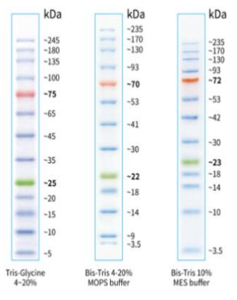 本产品由跨度从 5-245 kDa 的 13 种高度纯化并预染的重组蛋白质组成。其中 25 kDa 条带为绿色预染条带,75 kDa 条带为红色预染条带,方便判断各个条带的准确位置。本产品适合作为 SDS-PAGE 电泳时,变性蛋白样品的分子量参照,并可实时观察蛋白样品的电泳分离状况,也可用于检测 Westernblot 的转膜效率。由于共价结合的染料会影响蛋白质分子的电泳迁移率,本产品仅适于粗略地估计目的蛋白样品的分子量。