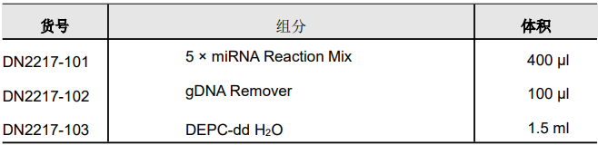 miRNA RT Kit 是采用茎环法原理的专用试剂盒, 5 × miRNA Reaction Mix 为一管式反转录预混 Mix,含有反转录所需的所有试剂(script Hˉ RTase、RNase Inhibitor、dNTP Mixture、Buffer),只需加入模板 RNA 和茎环引物即可进行反应,使得cDNA的合成更加的方便快捷。本试剂盒中使用了具有 DNA 分解活性的特殊 gDNA Remover,只需一步操作,即可同时完成基因组清除与逆转录反应,简化了操作步骤,避免了复杂加样过程造成的样品污染与 RNA 降解的风险。本制品中的组分script Hˉ RTase 具有极高的热稳定性,配以针对优化的缓冲体系,最大限度保证各种 miRNA 特异性逆转录产物的合成。