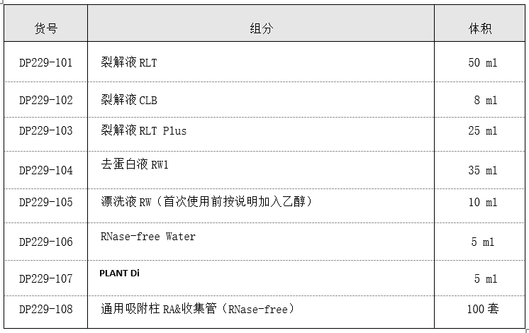 本产品无需使用苯酚和氯仿快速提取植物样本 RNA,试剂盒中所配备的通用吸附柱可以有效清除 gDNA 残留,得到的 RNA 一般不需要 DNase 消化,可用于反转录 PCR、荧光定量 PCR 等实验。独特的裂解液迅速裂解细胞和灭活细胞 RNA 酶,植物 RNA 助提剂 PLANT Di 帮助结合多糖多酚并通过离心去除, 吸附在柱上的残留 DNA 无法洗脱从而被清除掉。滤过的 RNA 用乙醇调节结合条件后,RNA 在高离序盐状态下选择性吸附于离心柱内硅基质膜,通过漂洗和离心的步骤,去蛋白液和漂洗液将细胞代谢物,蛋白等杂质去除, 在低盐 RNase free H20 的洗脱下得到纯净的 RNA。